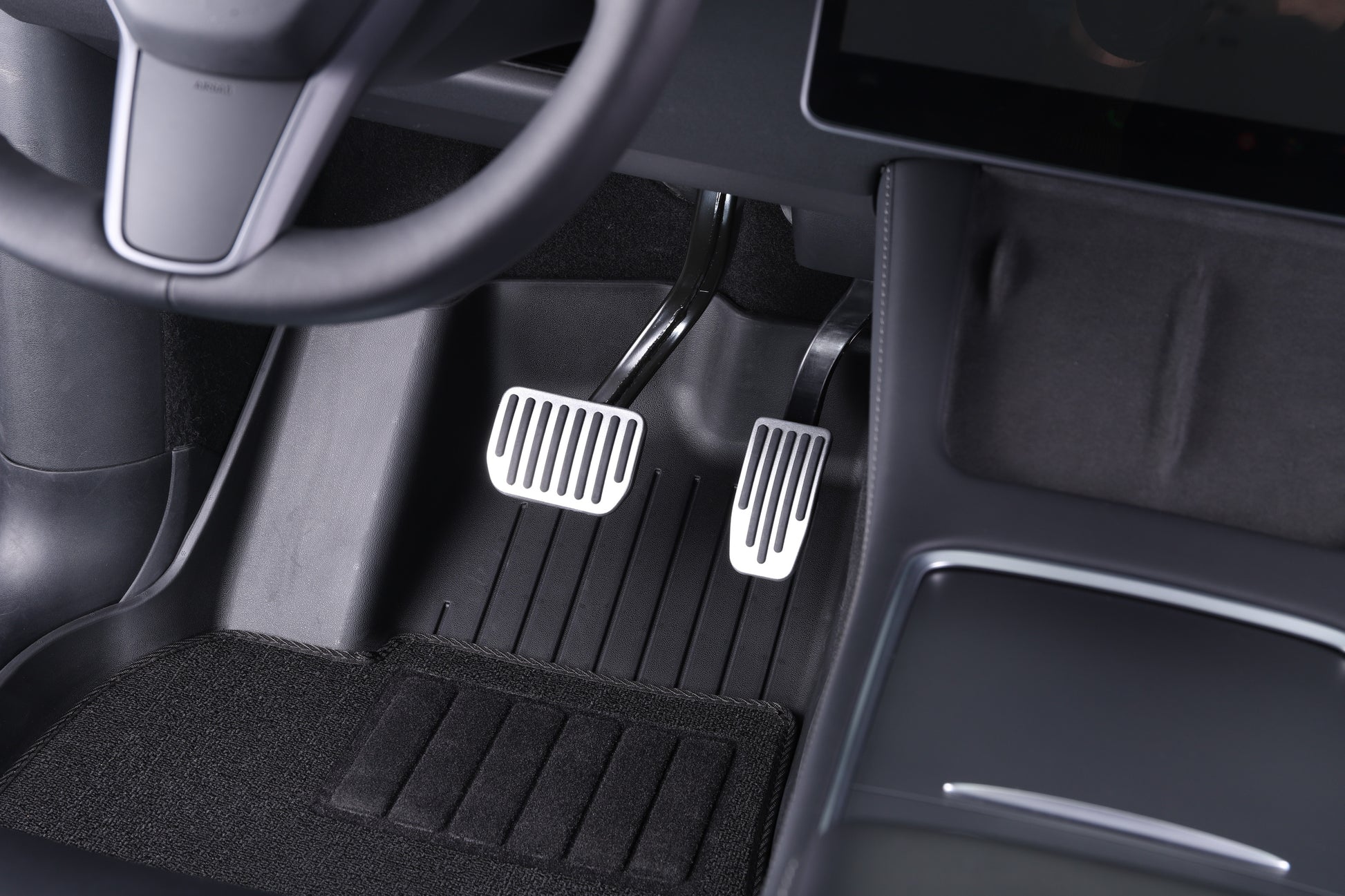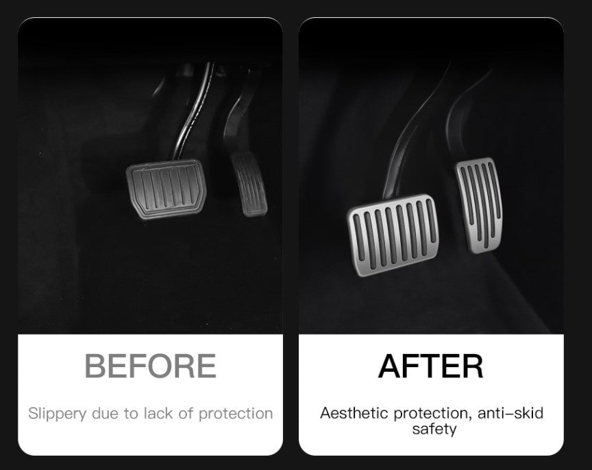 Elvix aluminum alloy pedal covers for Tesla Model 3/Y Enhance the safety and aesthetics of your Tesla Model 3 or Model Y with these precision-crafted aluminum alloy pedal covers. Designed to provide superior grip and control, the cleats feature raised rubber strips to increase friction - even when your boots are wet. Their sleek metallic finish adds a premium look to your vehicle's interior, while the anti-slip design ensures better pedal control and driving confidence. These covers are easy to install without tools and fit your existing pedals perfectly. They are a must-have accessory for any Tesla driver looking for both style and functionality. Specifications: Compatibility: Tesla Model 3 and Model Y Material: aluminum alloy + non-slip rubber Finish: brushed silver with black rubber inserts Features: anti-slip, wear-resistant, corrosion-resistant Installation: No tools, molded design Product weight: Brake: 78g, Throttle: 45g The package contains: 1 x Elvix Aluminum Alloy Pedal Cover Set for Tesla Model 3/Y Not affiliated with Tesla, Inc. Product shown is not official Tesla merchandise and is used for identification purposes only.